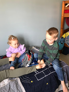 I went in the boy's room one night to see why they weren't asleep yet. They didn't even have their pajamas on, and Abram had Pace all trussed up at the ankles: